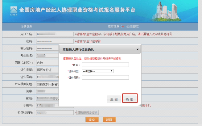 7.填写个人信息,带“*”的必填,填完点击“提交”、“确定”。