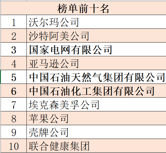 榜单前十名中,有3家企业来自中国,分别是国家电网、中国石油、中国石化,分别位居第三名、第五名、第六名。