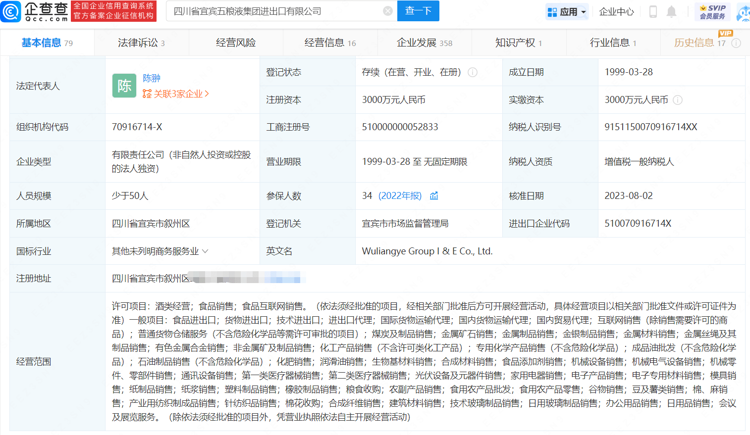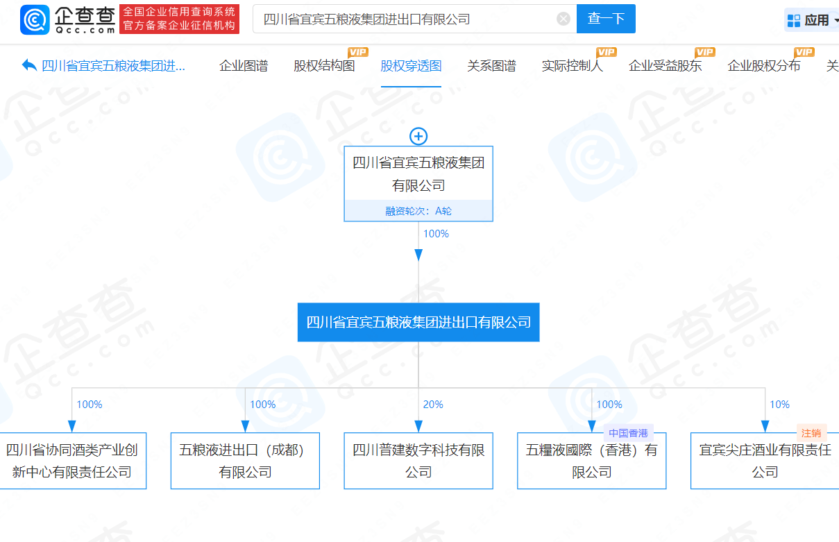 企查查信息显示,四川省宜宾五粮液集团进出口有限公司成立于1999年3月,法定代表人为陈翀,注册资本3000万人民币。该公司由四川省宜宾五粮液集团有限公司全资持股。