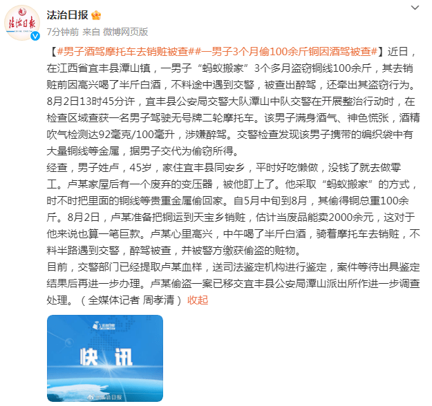 近日,在江西省宜丰县潭山镇,一男子“蚂蚁搬家”3个多月盗窃铜线100余斤,其去销赃前因高兴喝了半斤白酒,不料途中遇到交警,被查出醉驾,还牵出其盗窃行为。