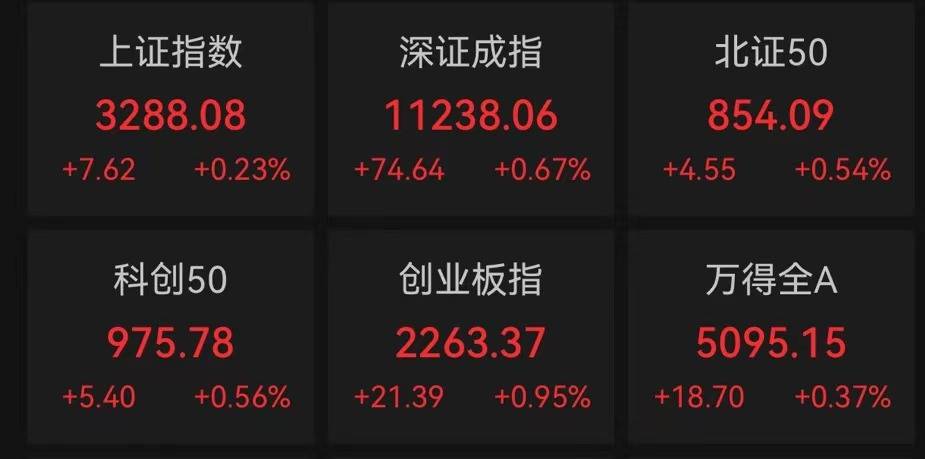 截至收盘,上证指数涨0.23%,报3288.08点;深证成指涨0.67%,报11238.06点;创业板指涨0.95%,报2263.37点。