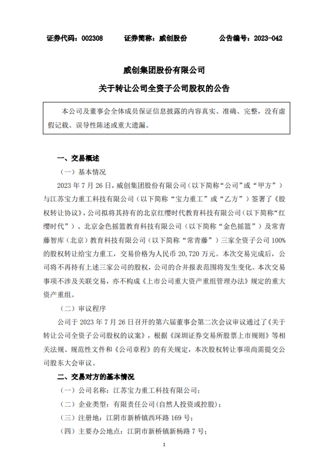 7月26日晚上,威创股份发布公告表示,将公司旗下三家教育类子公司出售给江苏宝力重工科技有限公司(以下简称“宝力重工”)。而此次交易的价格令人迷惑,按照公告显示,司拟将全资子公司北京红缨时代教育科技有限公司(以下简称“红缨时代”)、北京金色摇篮教育科技有限公司(以下简称“金色摇篮”)及常青藤智库(北京)教育科技有限公司(以下简称“常青藤”) 100%股权转让给宝力重工,交易价格约为2.07亿元。