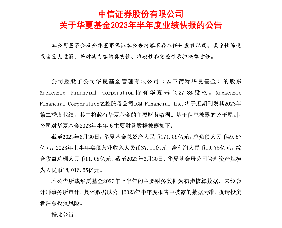 8月3日晚间,中信证券披露旗下控股子公司华夏基金上半年业绩快报。报告期内,华夏基金实现营业收入37.11亿元,净利润10.75亿元,综合收益总额11.08亿元。