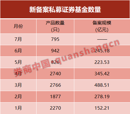 中国基金业协会数据显示,5月私募证券基金发行数量为826只,同样创下阶段性新低。6月,私募新发行数量升至942只,有所升温。不过,7月,新备案的私募证券基金产品总量降至795只,再创年内新低。