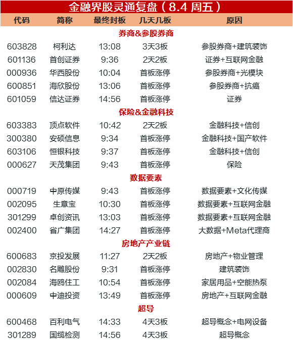 周五A股共19股涨停(不含ST股),24股封板未遂,连板股总数4只,柯利达(基建+参股券商)3连板,京投发展(房地产)、首创证券(券商)、顶点软件(金融科技)2连板。