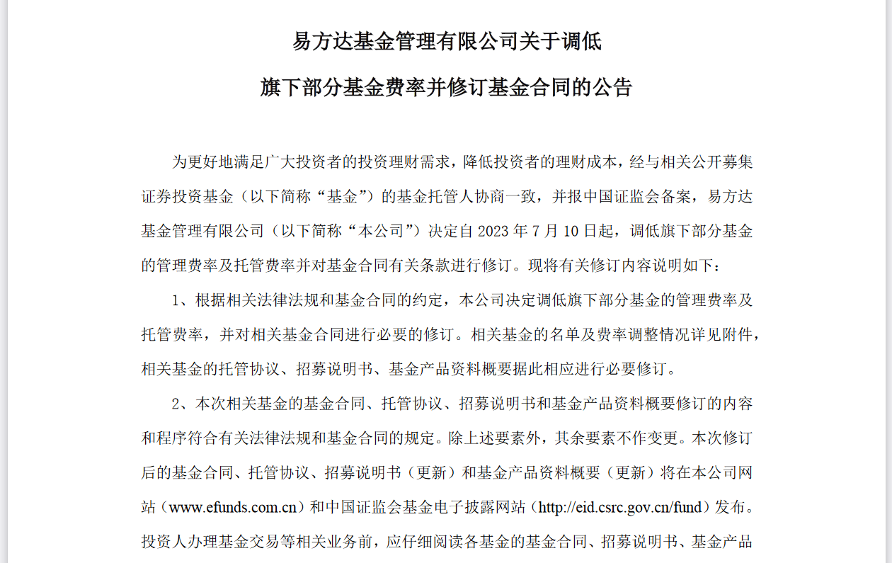 继易方达基金、广发基金、中欧基金等19家头部公募率先宣布降低基金管理费率、托管费率后,天弘基金、平安基金、国投瑞银也宣布加入基金降费队伍。