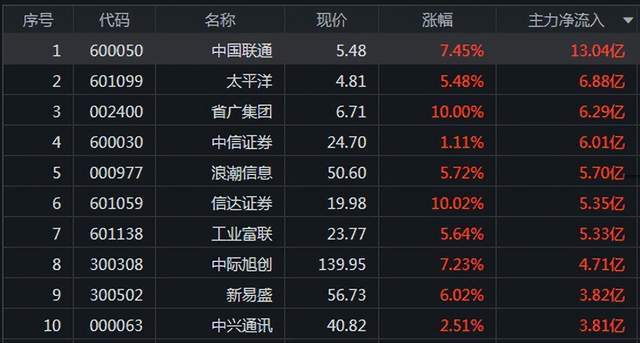 今日主力资金净流入前10只股: