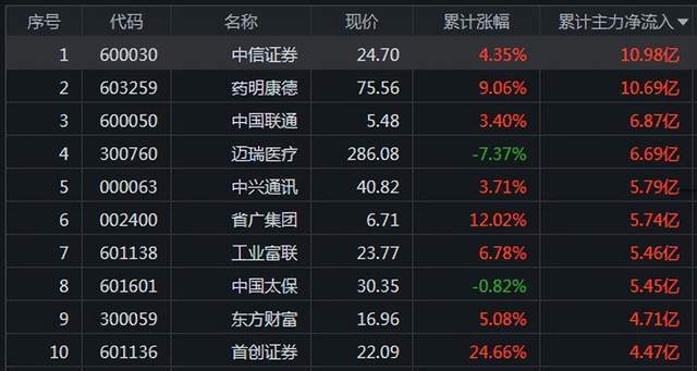 一周流入资金排名前10只股:
