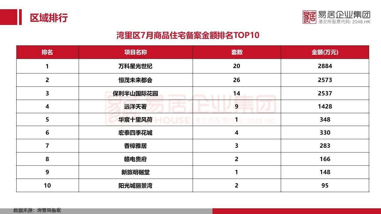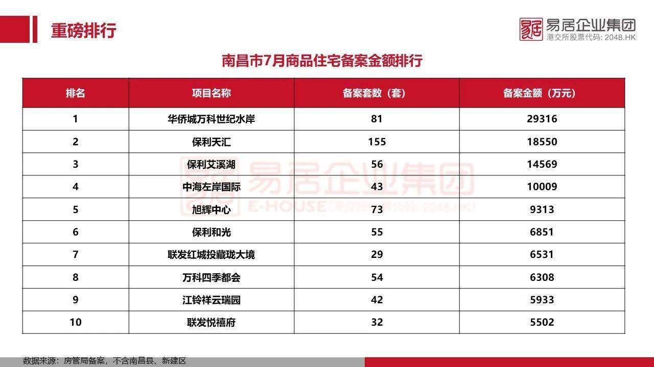 据江西易居研究中心数据显示,华侨城万科世纪水岸7月共计备案81套,总备案金额约2.93亿位居第一;保利天汇7月共计备案155套,备案总金额约1.85亿排名第二;保利艾溪湖7月共计备案56套,备案总金额约1.45亿列第三;前十方面,保利共计有3盘入榜,保利和光以55套、0.68亿的成绩位居第六位。