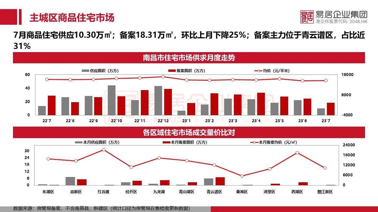 (乐居买房)据江西易居研究中心数据显示,7月南昌新房供应25.97万方,备案19.80万方,环比下降32%;备案主力为青云谱区,占比27%;其中住宅供应10.30万方,备案18.31万方,环比上月下降25%,备案主力同样为青云谱区,占比近31%。