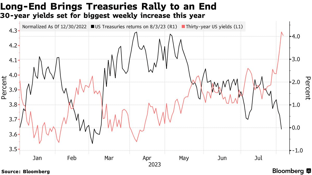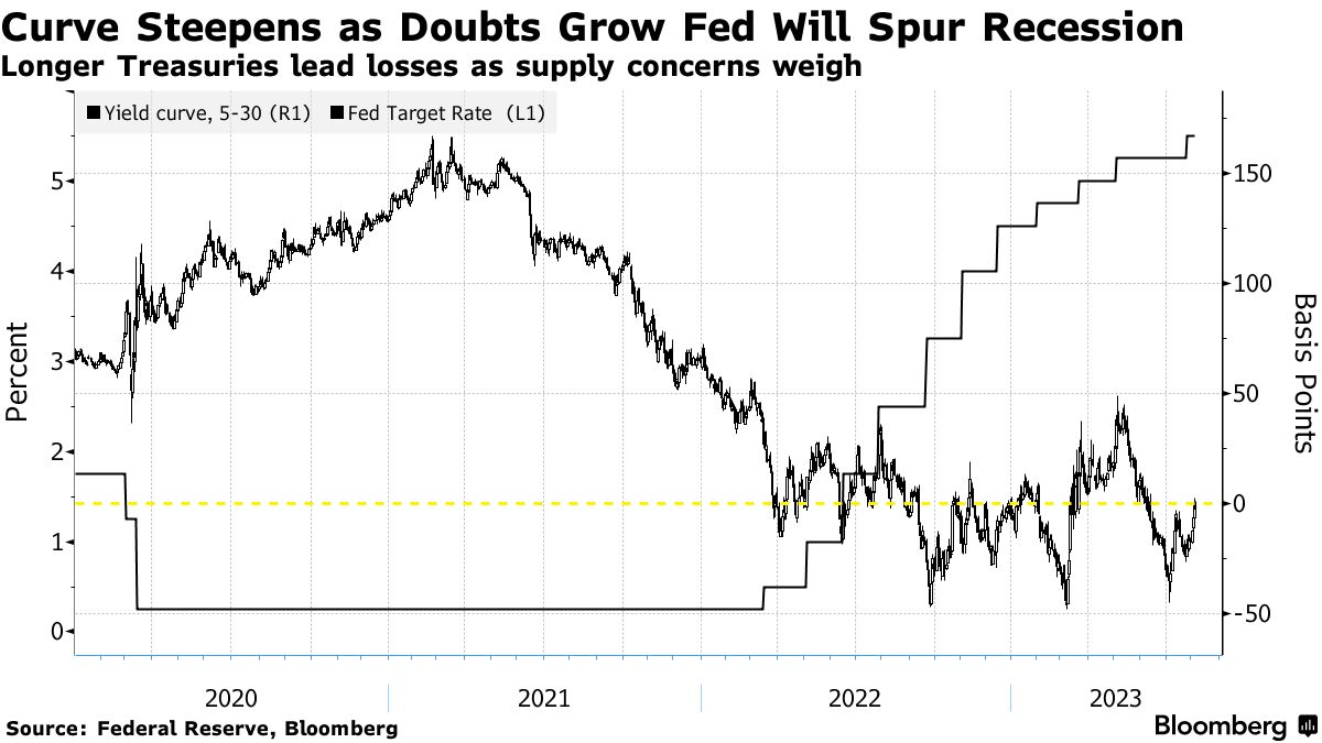 相反,强劲的经济数据和好于预期的企业财报正让交易员相信,美联储将在不出现经济严重放缓的情况下抑制通胀,这促使他们要求更高的收益率来持有期限更长的债券。长期债券还受到政府增加新债发行计划和惠誉评级下调美国信用评级的打击。
