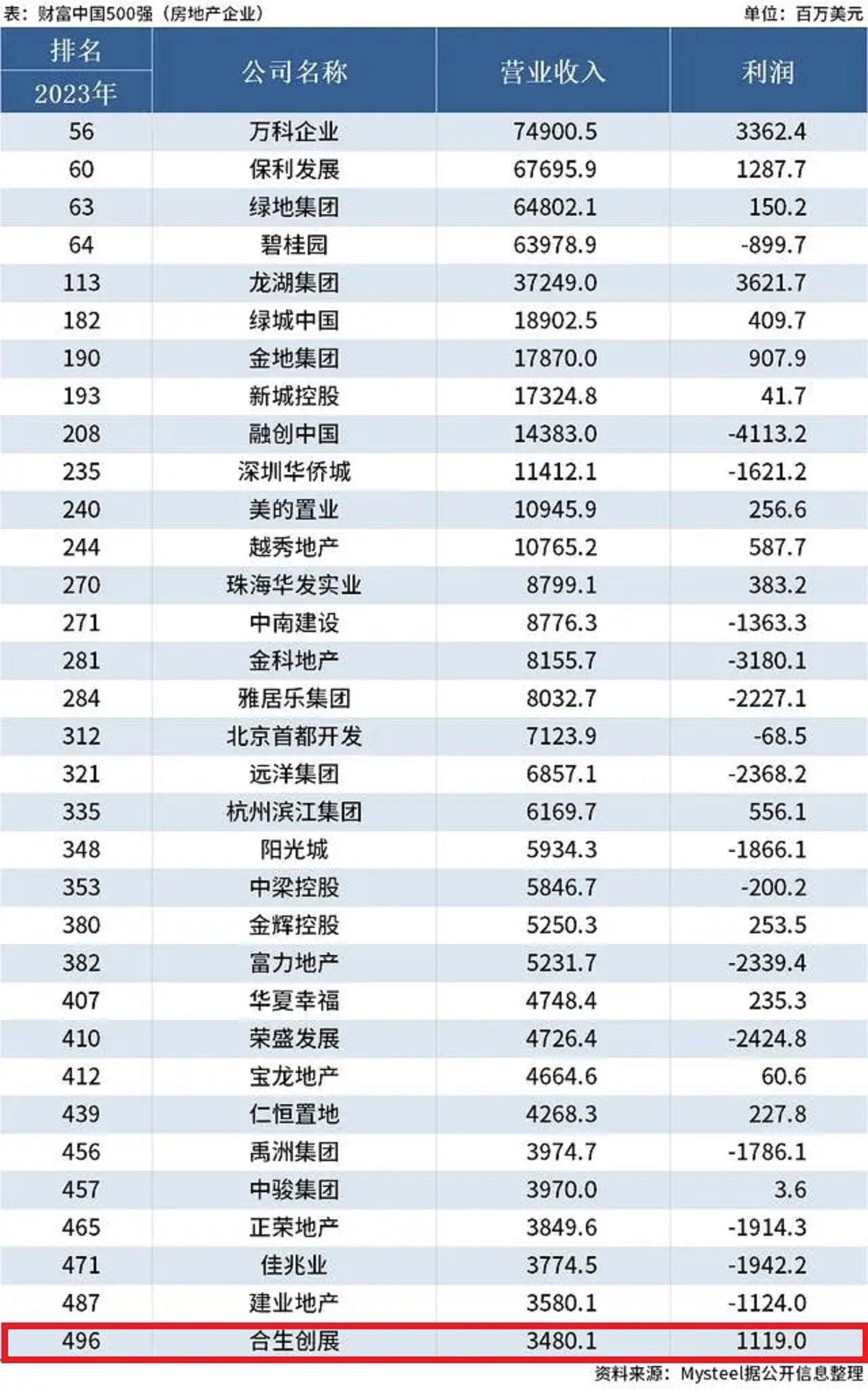 近日,2023年《财富》中国500强排行榜揭晓,合生创展集团有限公司以3480.1百万美元的营收位列第496位,利润为1119百万美元。