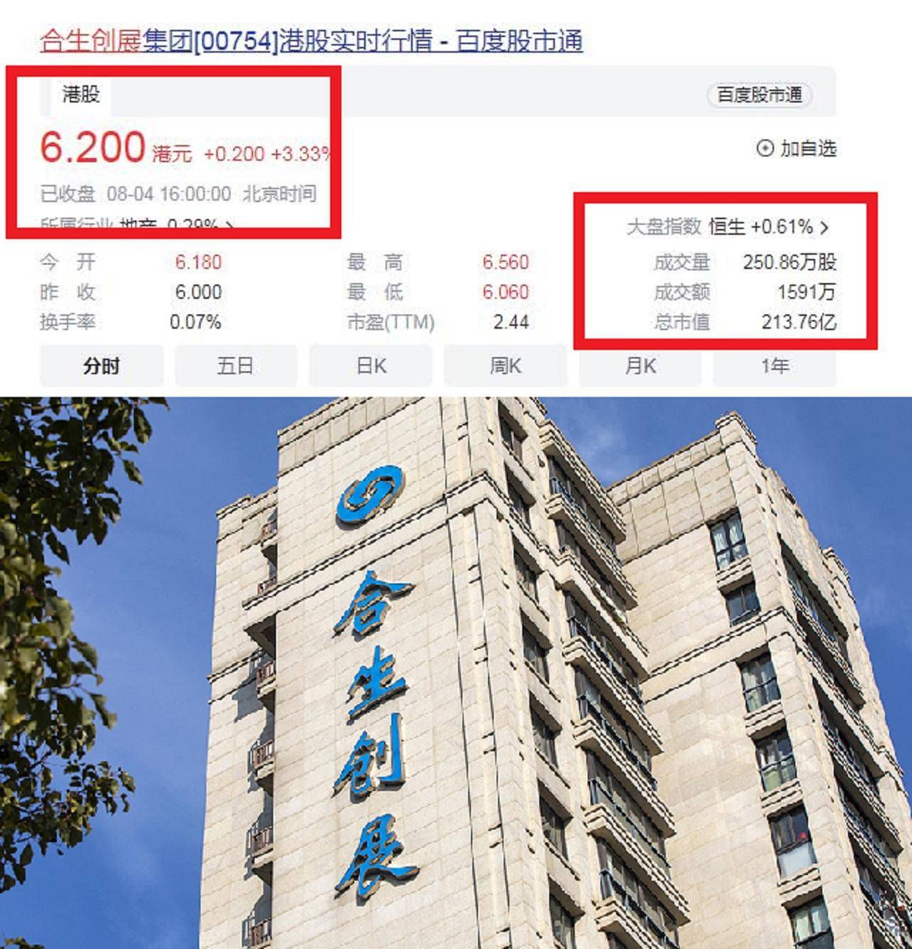 截止北京时间2023年8月4日收盘,合生创展集团的股票价格为6.200港元/股,总市值为213.76亿港元。