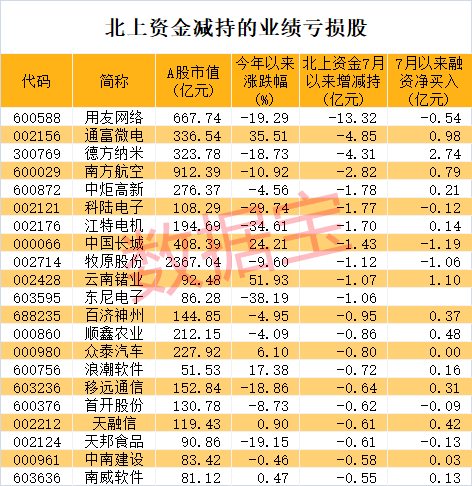 在业绩下滑同时,部分公司遭到资金出逃。数据宝统计,按照区间成交均价计算,北上资金7月以来减持超亿元的有11家公司,包括用友网络、通富微电、德方纳米、南方航空、中炬高新等。用友网络遭北上资金净卖出13.32亿元,居首位,该股是云计算龙头之一,今年以来跌幅达到19.29%。
