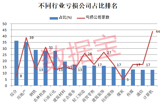 由于不同行业公司的数量差别较大,单纯看数量不能反映行业的真实情况。以亏损公司占行业总数比值,可以得出不同行业亏损公司比例。
