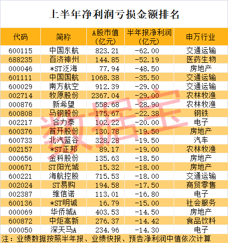 百济神州上半年亏损52.19亿元,排在第二位。亏损金额排名靠前的还有*ST泛海、中国国航、南方航空、牧原股份、新希望等。