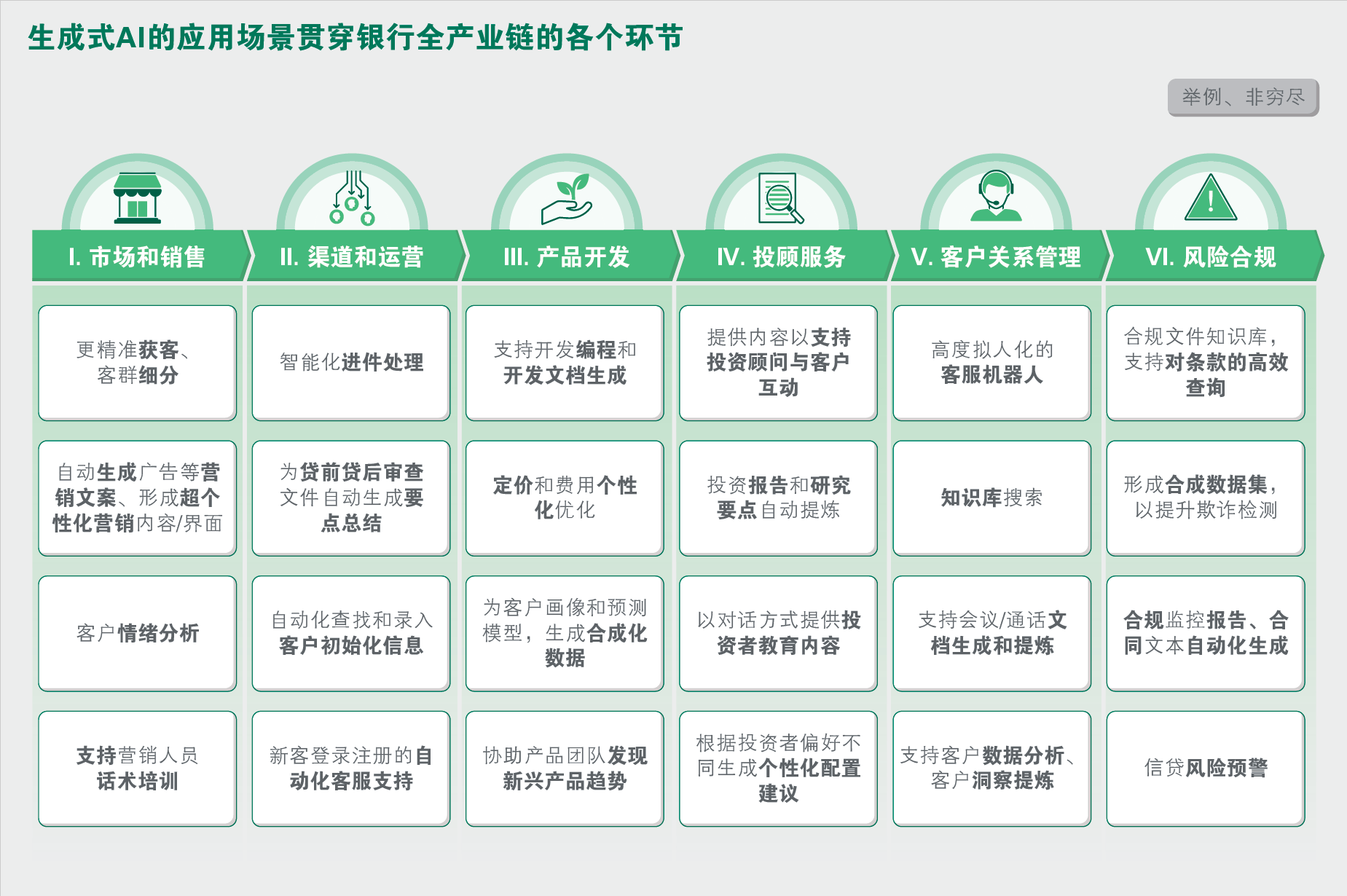 生成式AI的应用场景可以贯穿银行全产业链的各个环节:每个职能部门、每条业务线本质上都能找到生成式AI的应用场景。同时,有实践表明规模化应用生成式AI有望为银行业带来可观的降本增效收益。