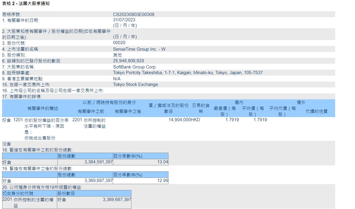 原标题:软银集团减持商汤股票 持股比例降至12.99%