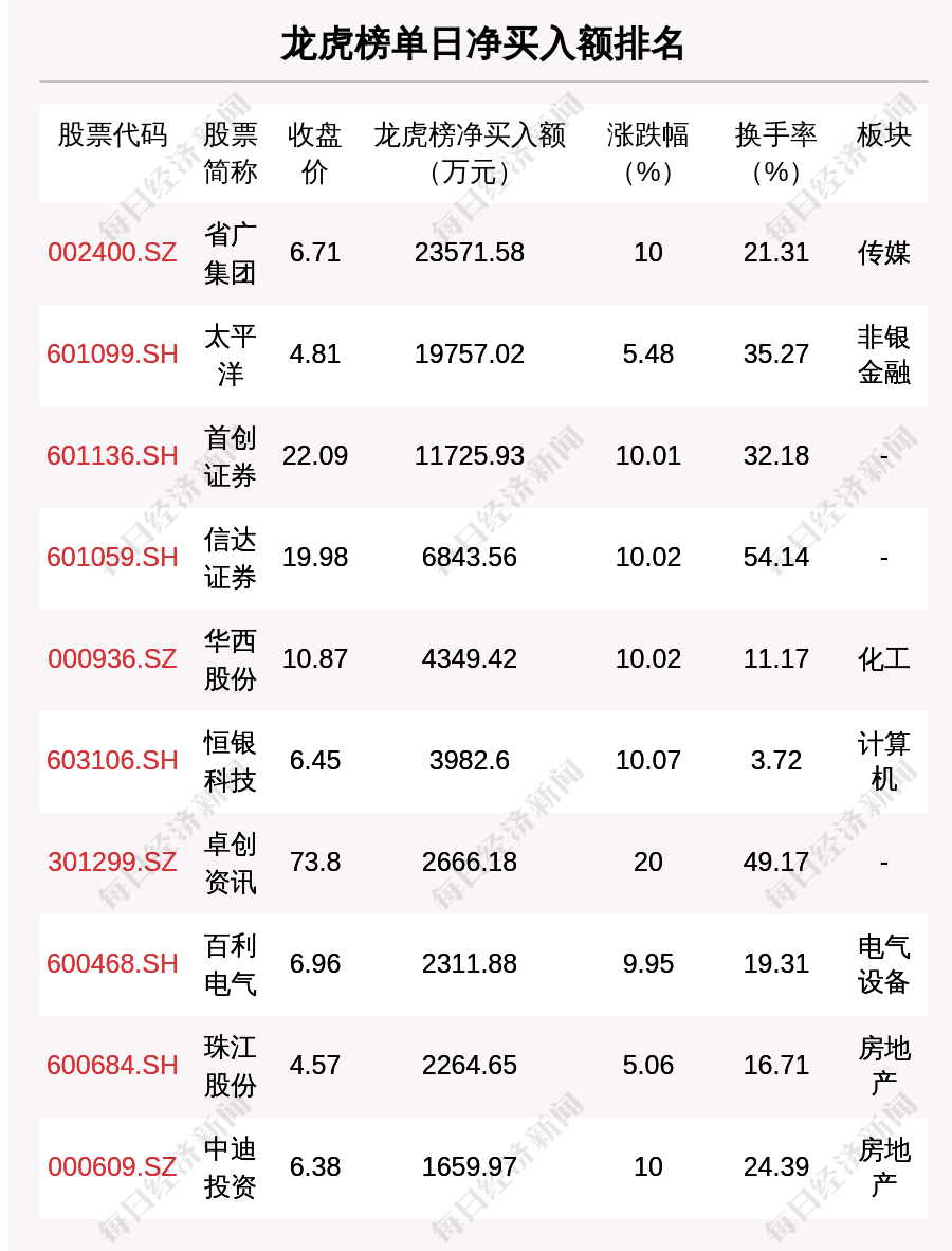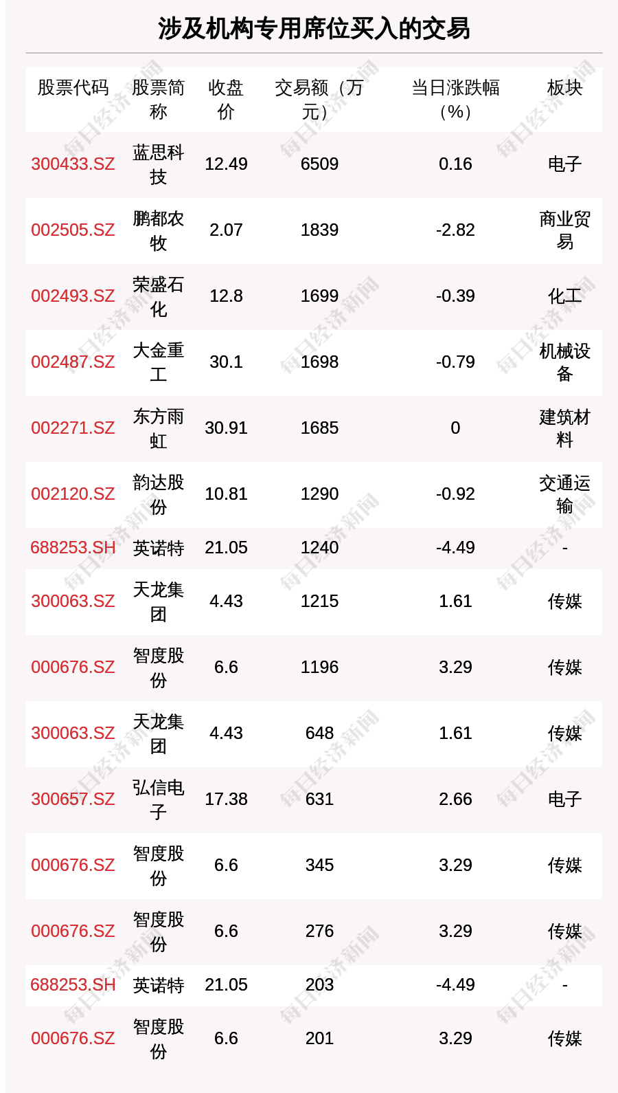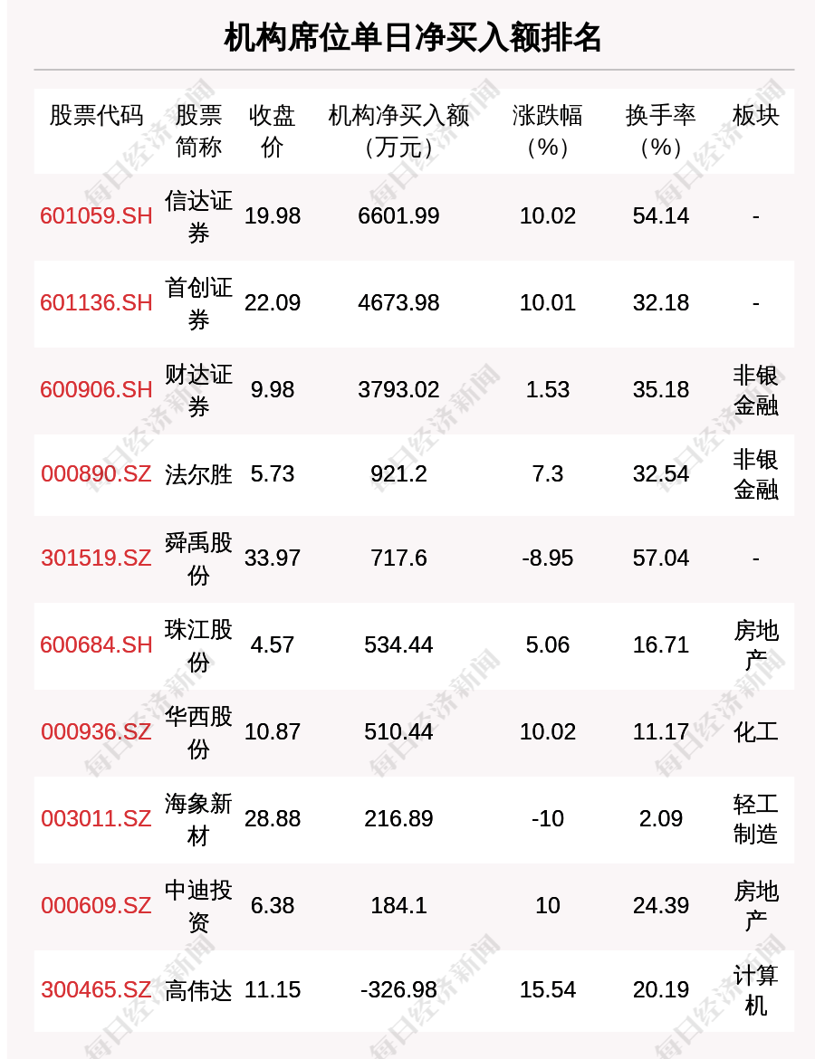在龙虎榜中,涉及机构专用席位的个股有23只,净买入额前三的是信达证券、首创证券、财达证券,分别为6601.99万元、4673.98万元、3793.02万元。