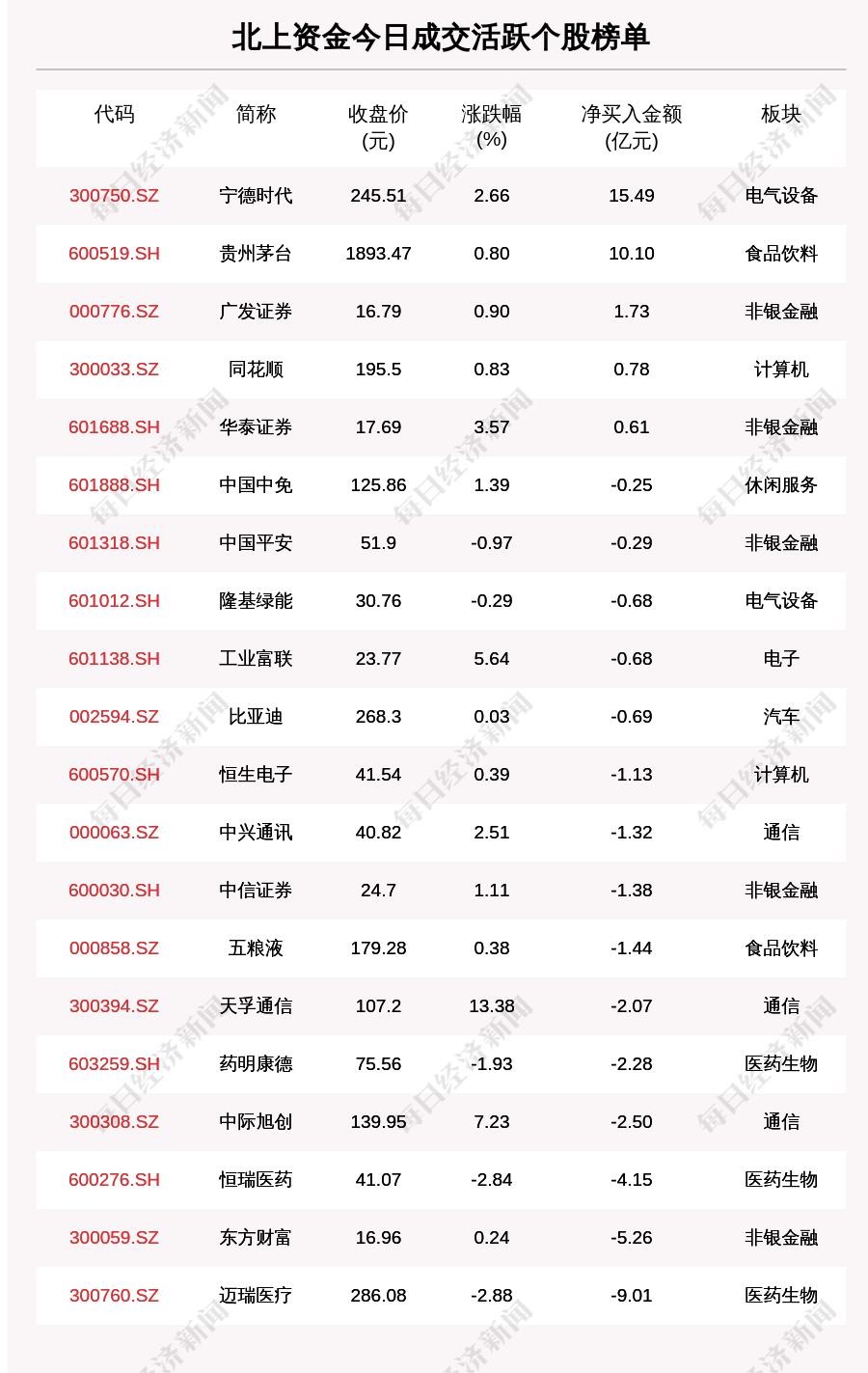 8月4日,北上资金成交活跃个股榜单中,净买入个股共5只,金额最多的是宁德时代(300750.SZ,收盘价:245.51元),净买入15.494亿元;净卖出个股共15只,金额最多的是迈瑞医疗(300760.SZ,收盘价:286.08元),净卖出9.010亿元。