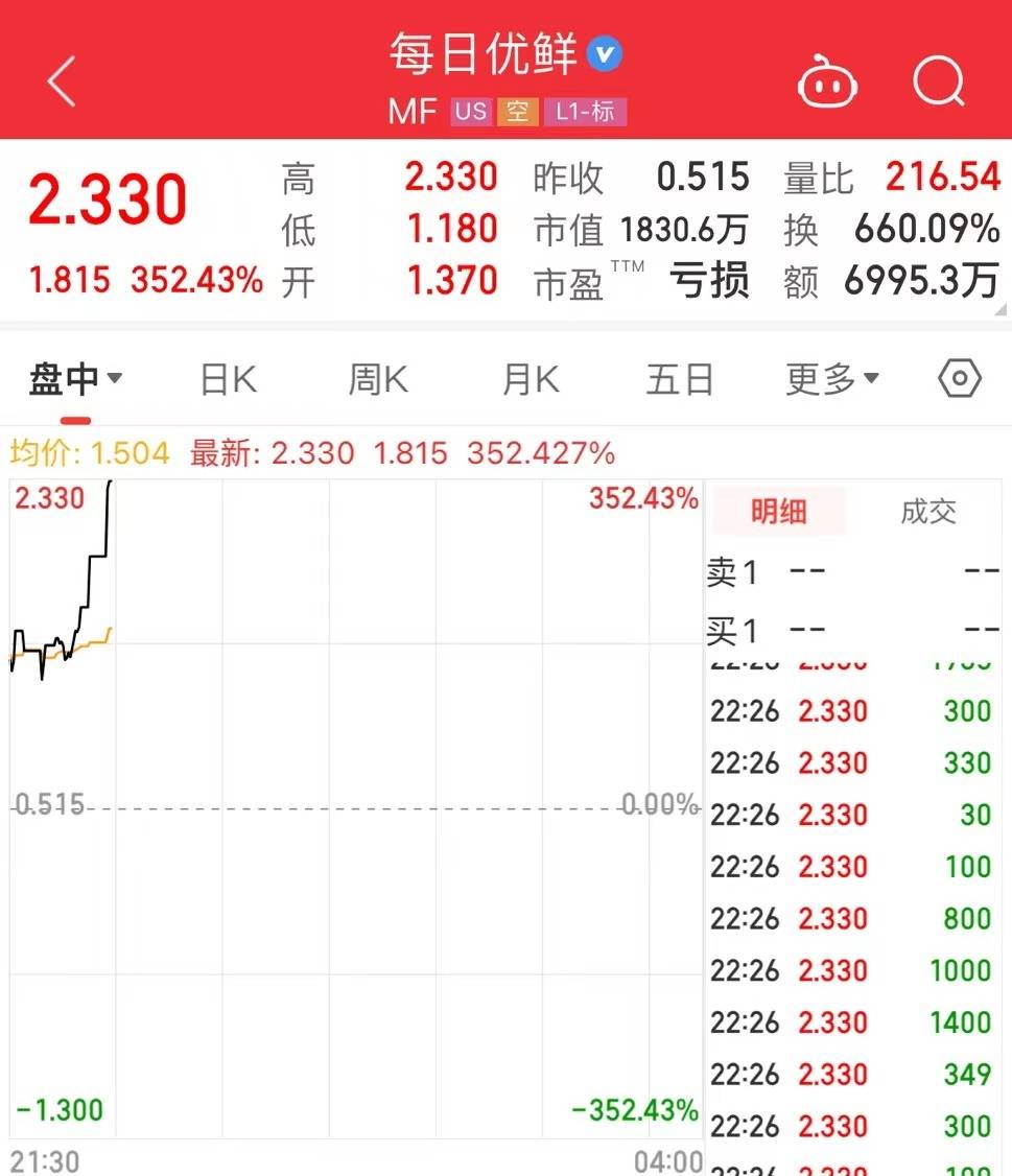 北京时间8月4日晚美股开盘,每日优鲜(MF)飙涨,截至发稿前(距开盘约1小时),公司股价已上涨352.43%,熔断2次。消息面上,每日优鲜获2亿元融资,拟转型数字营销服务商。