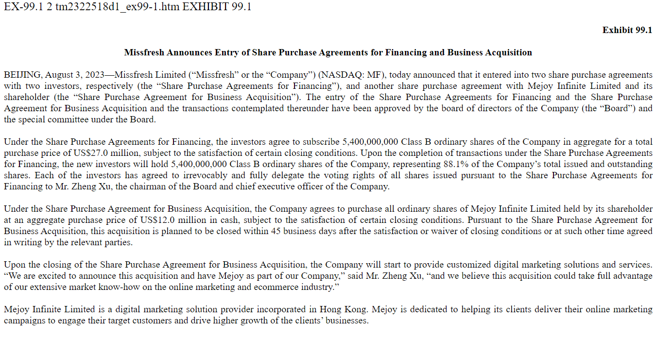 根据另一份股票购买协议,每日优鲜同意以1200万美元的现金购买其股东持有的Mejoy Infinite Limited的所有普通股,但须满足某些成交条件。股份购买业务收购协议完成后,每日优鲜将开始提供定制的数字营销解决方案和服务。