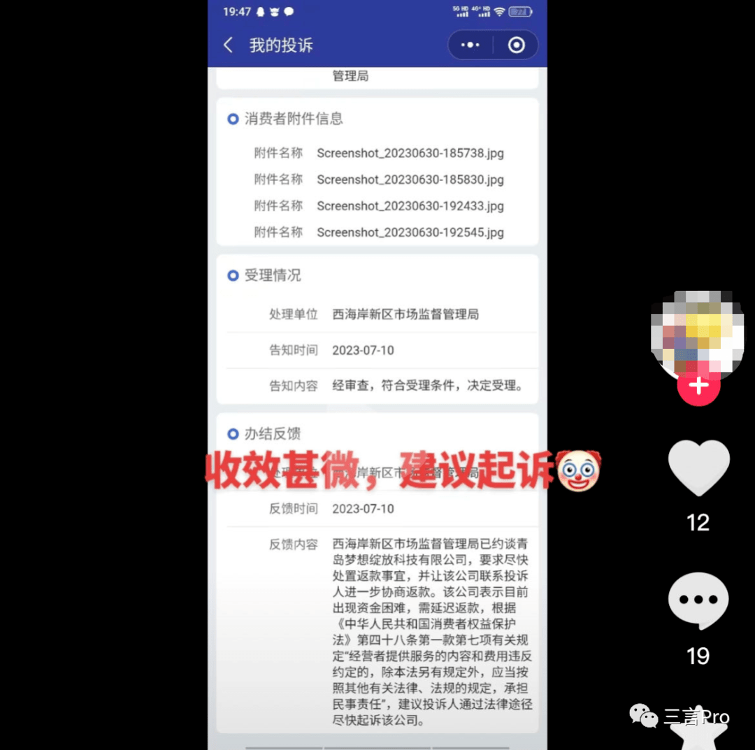 有网友通过12315对梦想绽放进行了投诉,但该网友表示收效甚微,对方建议起诉。