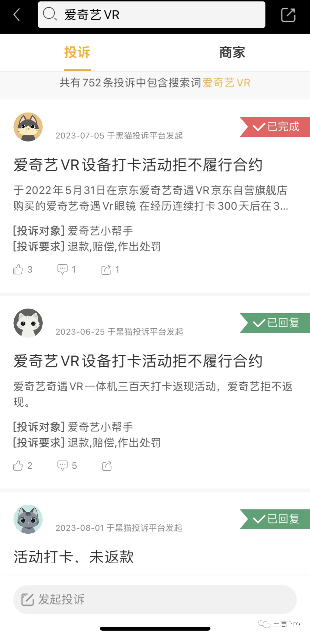 在黑猫投诉平台,笔者以“爱奇艺VR”为关键字进行搜索,显示共有752条投诉,基本都是投诉爱奇艺VR设备打卡活动不履行合约。