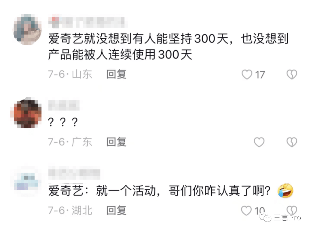 还有网友调侃称,“爱奇艺就没想到有人能坚持300天,也没想到产品能被人连续使用300天”。