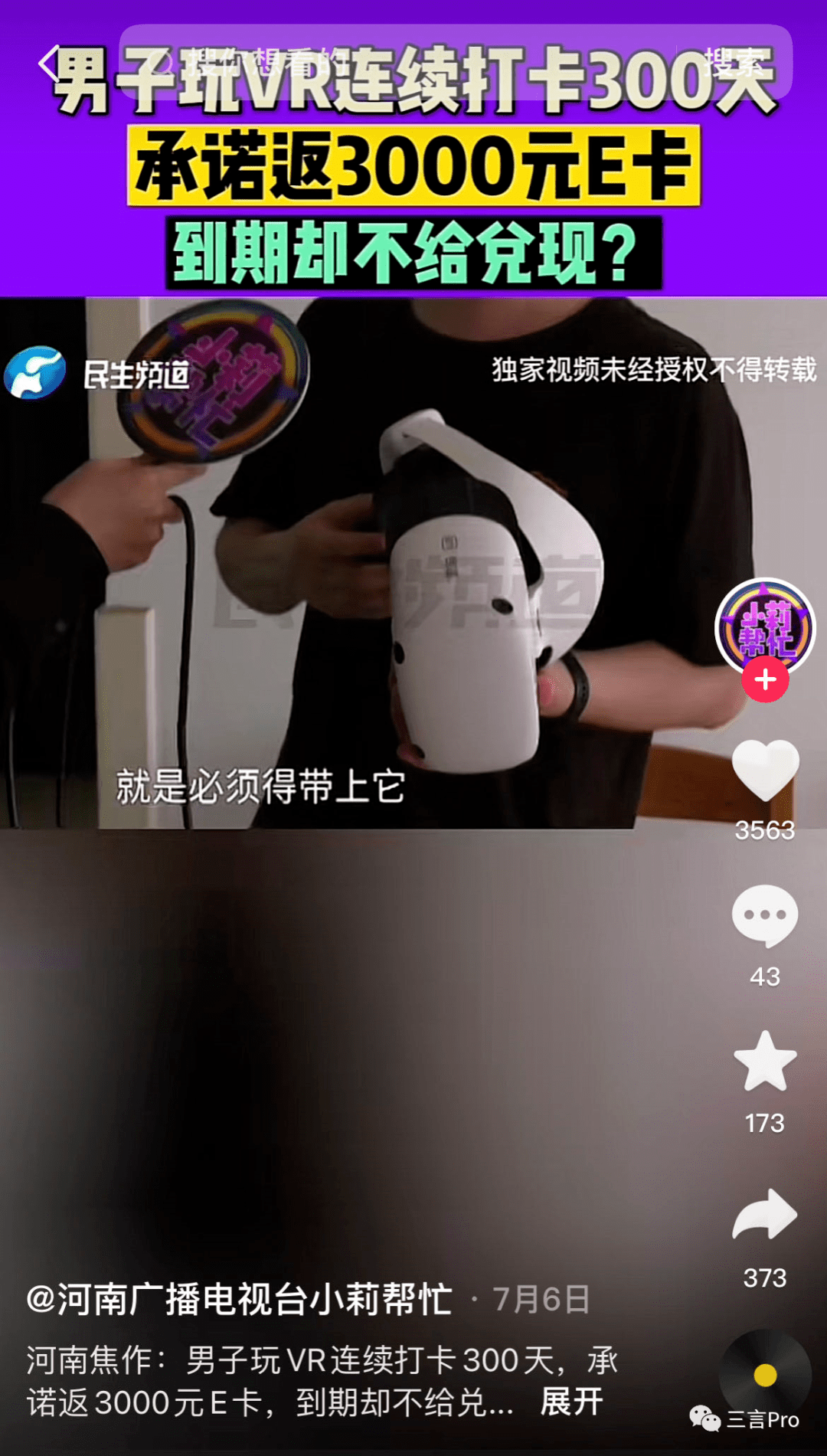 河南电视台“小莉帮忙”发布的视频显示,焦作沁阳的杜先生,称自己去年6月15日在网上花2816元买了奇遇VR设备,当时有一个活动,打卡300天,可以返3000元的E卡。