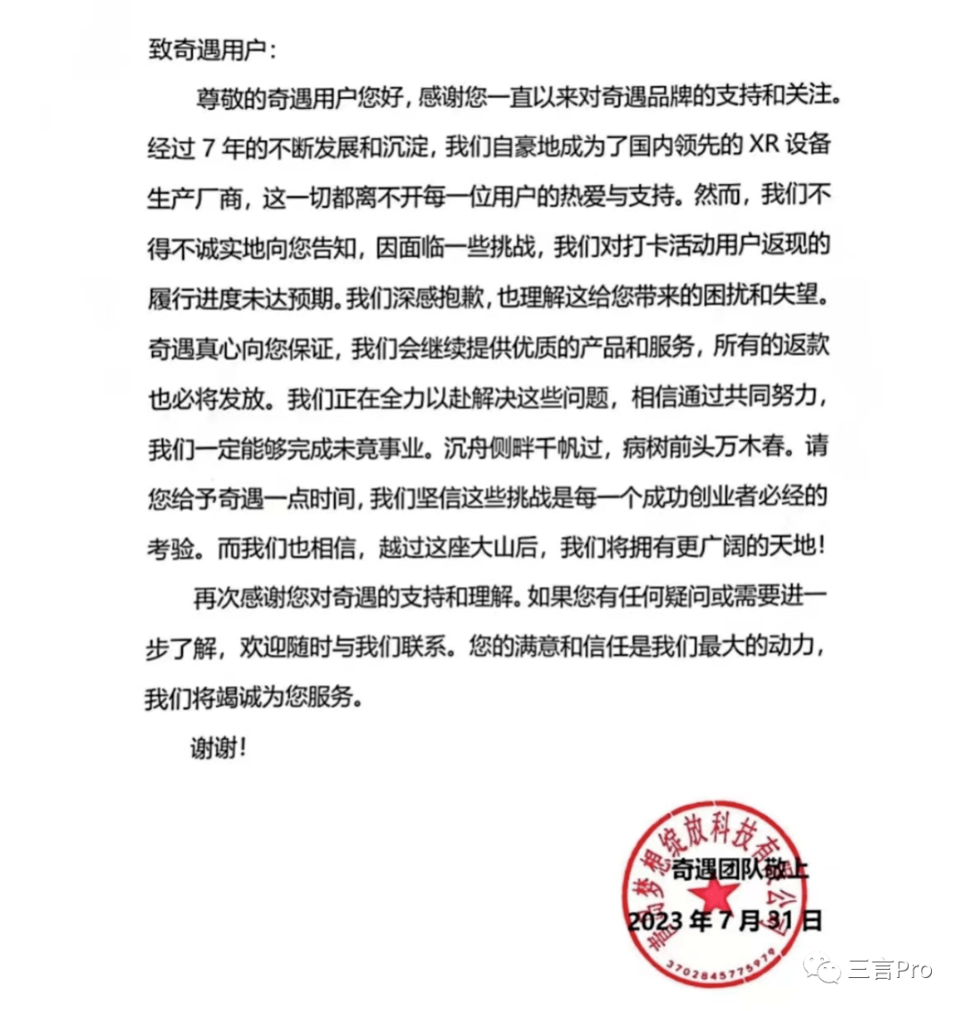 根据一些网友发布的截图显示,奇遇团队对此回应称,因面临一些挑战,奇遇团队对打卡活动用户返现的履行进度未达预期。奇遇团队表示,所有的返款必将发放,其正在全力以赴解决这些问题。