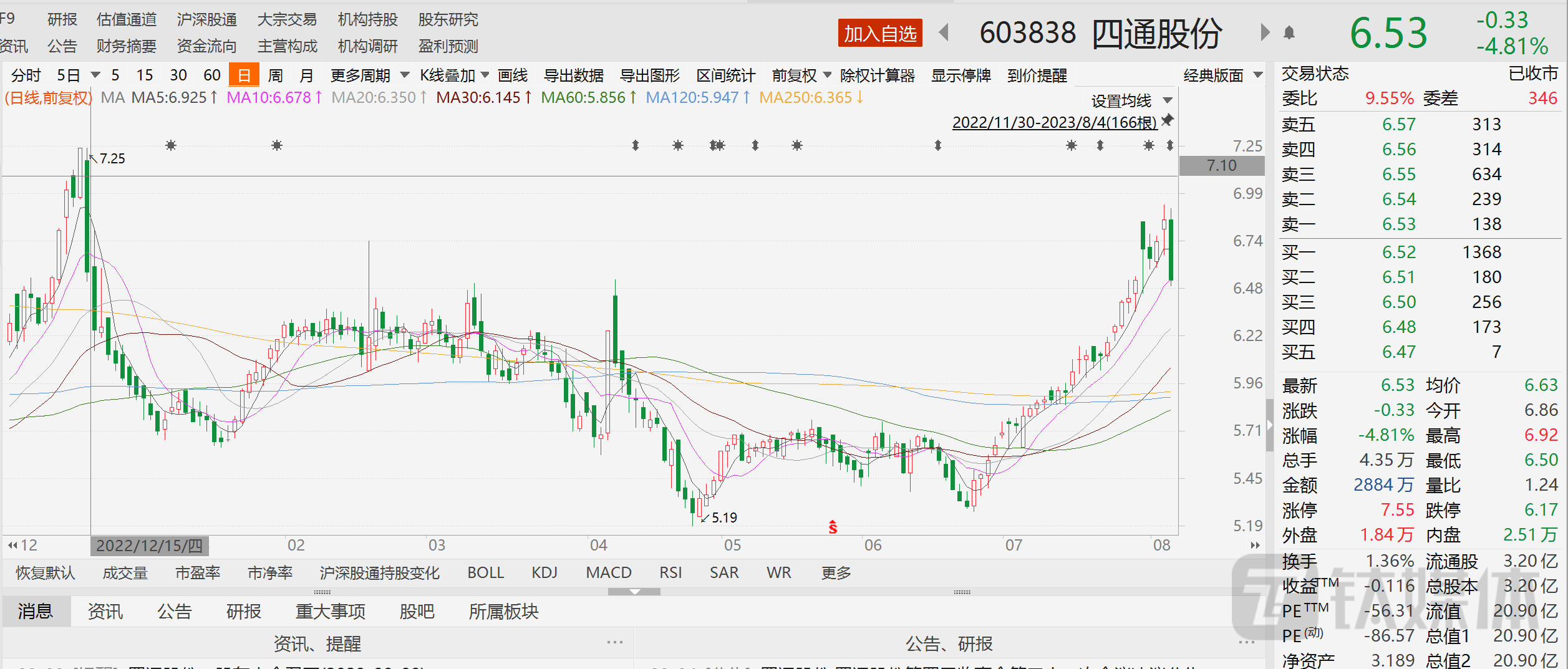 受利空影响,今日公司股价在小幅冲高之后就震荡下跌。截至8月4日收盘,股收报6.53元,下跌4.81%,总市值20.9亿元。