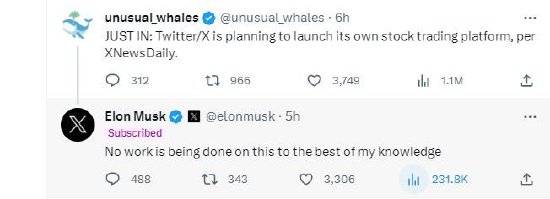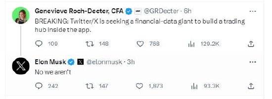 后来,马斯克又回应了另一位用户,该用户称:“Twitter/X正在寻求一家金融数据巨头在其应用程序内建立一个交易中心。”马斯克说:“不,我们没有。”