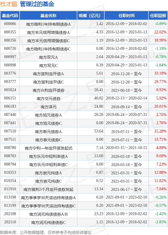 杜才超先生:中央财经大学金融学硕士,具有基金从业资格。2012年7月加入南方基金,历任债券交易员、债券研究员、信用分析师。2016年3月至2016年12月,任南方润元、南方稳利、南方多利、南方金利的基金经理助理。2016年12月至2018年2月,任南方润元、南方稳利基金经理;2016年12月至今,任南方丰元、南方宣利基金经理;2018年9月至今,任南方泽元基金经理;2018年12月至今,任南方交元基金经理;2019年6月至2020年7月31日任南方旭元债券型发起式证券投资基金基金经理;2019年7月至今,任南方泰元基金经理。2018年12月13日至2020年2月14日担任南方交元债券型证券投资基金基金经理。2020年3月18日起担任南方乐元中短期利率债债券型证券投资基金基金经理。自2020年4月29日起至2023年1月13日任南方双元债券型证券投资基金基金经理。2021年6月18日担任南方兴利半年定期开放债券型发起式证券投资基金基金经理。曾任南方宁利一年定期开放债券型发起式证券投资基金基金经理。曾任南方丰元信用增强债券型证券投资基金基金经理。曾任南方季季享90天滚动持有债券型证券投资基金的基金经理。
