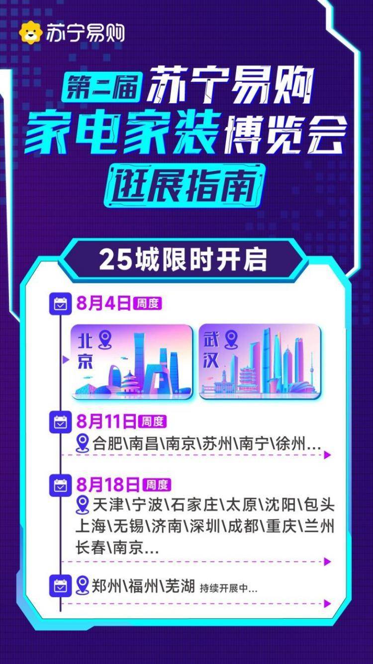为响应政策号召,促进家电家居消费,满足用户家庭场景换新需求,苏宁易购于8月4日启动“第二届818家电家装博览会”,联合百大家电家装品牌,加码“政企厂银”四重补贴,推出亿元让利优惠,为消费者打造“一站置家”的逛购体验。此次家博会活动将持续至9月4日,覆盖北京、上海、南京、深圳、天津、重庆、武汉、成都、合肥等全国25个城市,预计带动家电家装消费超20亿元。