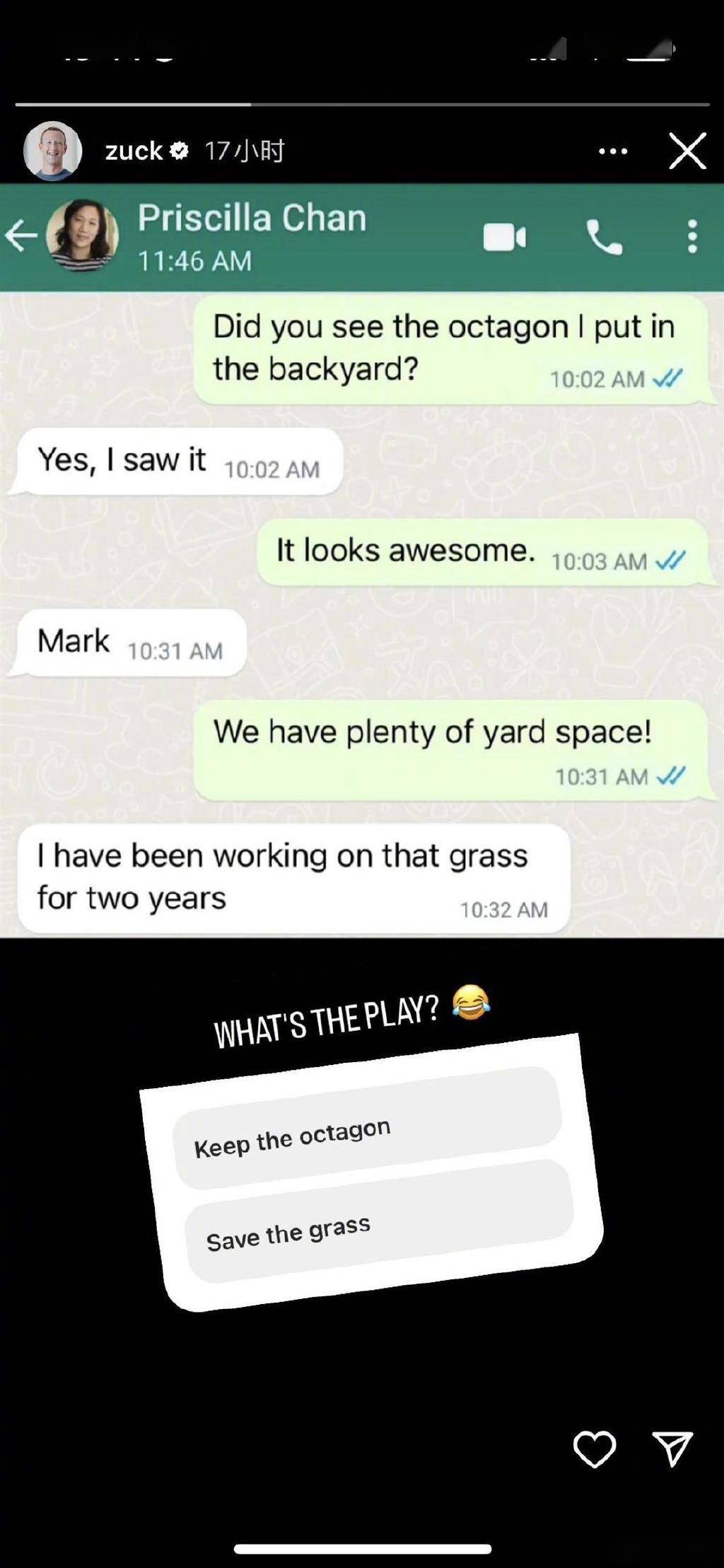 扎克伯格晒出一张与妻子普莉希拉·陈的聊天记录,扎克伯格问妻子“你看到我放在后院的八角笼了吗?”,普莉希拉·陈回复“是的,我看到了。”