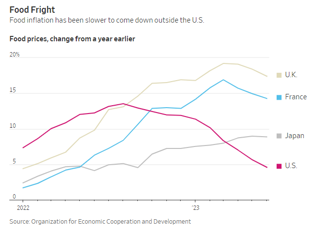 在截至6月份的一年中,英国食品价格上涨了17.4%,日本食品价格上涨了8.9%,法国食品价格上涨了14.3%。在上述每个国家,食品价格的上涨速度都比其他商品和服务的价格快得多。