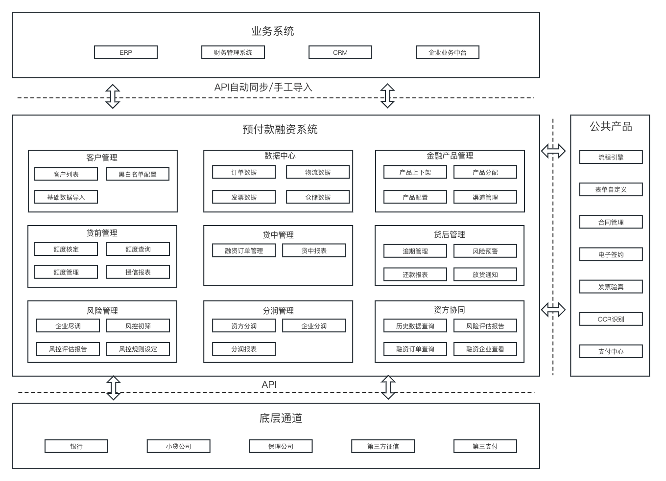 预付款融资产品模块分为客户管理、数据中心、金融产品管理、贷前管理、贷中管理、贷后管理、风险管理、分润管理、资方协同。并且需要和客户的业务系统、相关的银行、第三方征信、内部相关系统对接。