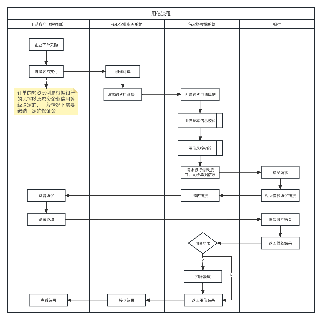 供应链金融系统筛查后会同步相关数据给银行,放款需要签署放款协议,签署协议后银行完成最终风控审核并且进行放款。