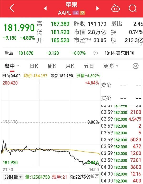 热门科技股也都变化极大,其中苹果报181.99美元,跌4.8%,创年内最大单日跌幅,市值失守3万亿美元,相当于一夜蒸发约1444亿美元(约合10355亿元人民币)。
