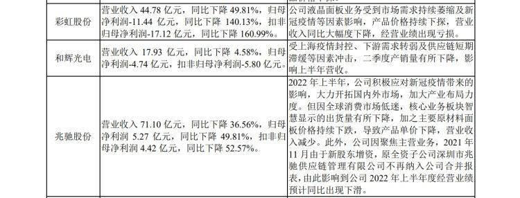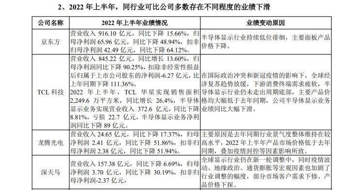 据回复函,2022年显示面板行情低迷。2022年上半年,同行业可比公司多数存在不同程度的业绩下滑,惠科股份自然亦难独善其身,其2022年上半年经营业绩与多数同行业可比公司变动趋势一致。