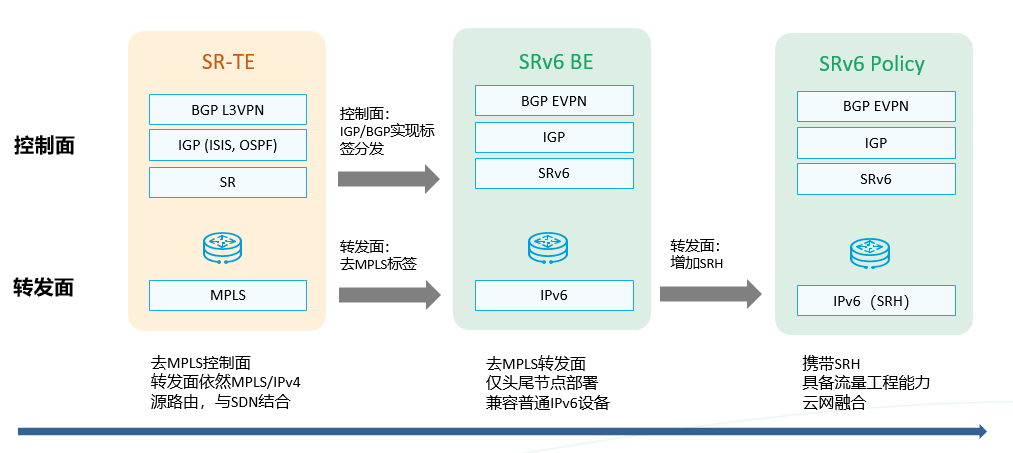 首先,北京银行明确制定了“前瞻试点+平滑演进”的技术演进路线。在2019年之初,经过大量的厂家调研、技术论证、试点测试等工作,选择了以SR-TE进行初步试点,并最终用四年的时间完成了从SR-TE到SRv6 BE和SRv6 Policy的渐进式演进。