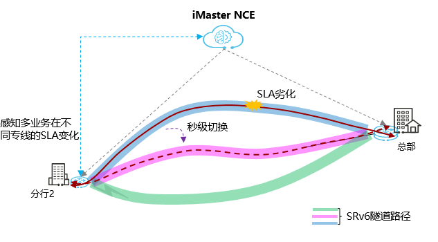 智能云骨干网实现了一网多业务统一融合承载,即通过一张网覆盖总行/一级分行/办公机构,满足生产办公、测试培训、语音视频等不同业务的统一融合承载,并基于EVPN技术实现多业务的安全逻辑隔离,解决了多分支机构互联成本高的问题。同时,SRv6 Policy可以为多业务提供差异化SLA保障,基于丰富的智能算路策略和最小开销、最大带宽、最低时延等10+计算因子提供最优路径计算结果,在降低运营成本的同时极大的提升了业务体验,以降本增效助力银行集团化运营战略发展。
