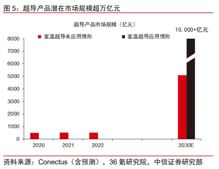 刘易等人进一步表示,室温超导在科学、医药、运输、工业、能源等各领域都有巨大应用空间,如果室温超导发展顺利,预计仅替代传统电线电缆市场的超导线缆市场规模即超过万亿元。