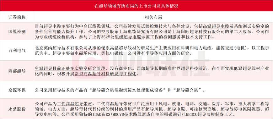 据财联社不完全统计,在超导领域有所布局的上市公司包括国缆检测、百利电气、西部超导、京源环保和永鼎股份等,具体如下:
