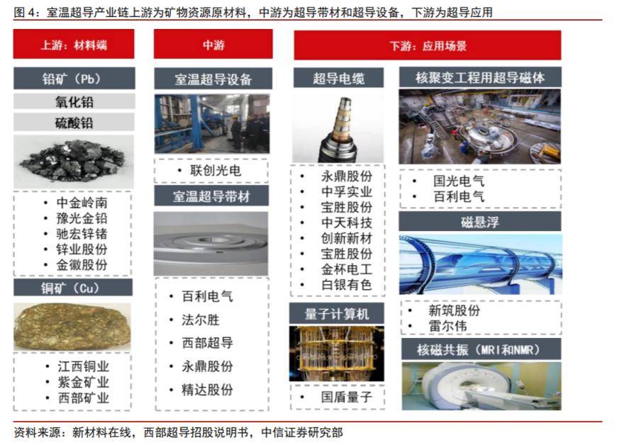 从产业链来看,室温超导上游为矿物资源原材料,涉及A股上市公司包括中金岭南、豫光金铅、江西铜业、紫金矿业等;中游为超导带材和超导设备,上市公司包括联创光电、百利电气、西部超导等;下游为超导应用,上市公司包括永鼎股份、国光电气、新筑股份等。
