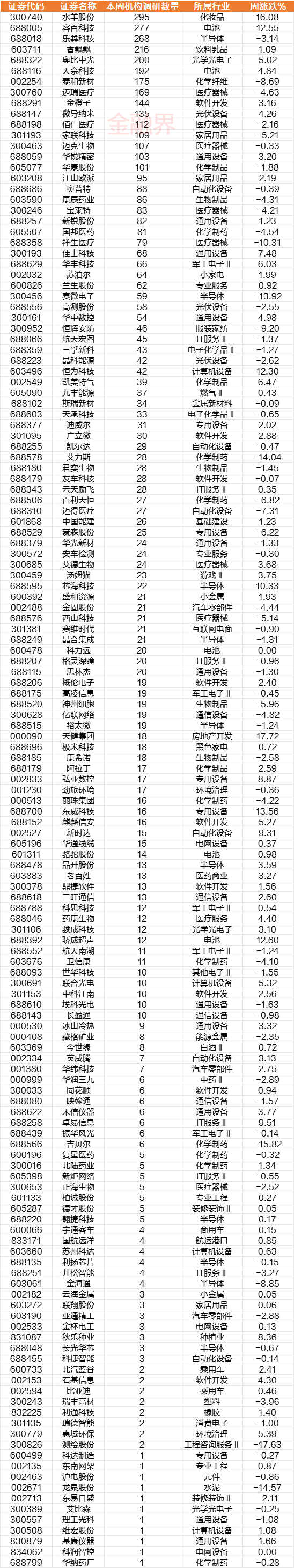 容百科技、乐鑫科技、香飘飘、奥比中光分别获得了277家、268家、216家以及200家机构的聚焦,天奈科技、泰和新材、迈瑞医疗、金橙子等10家公司均迎来超过100家机构的调研,江山欧派、奥普特、康辰药业也备受关注。