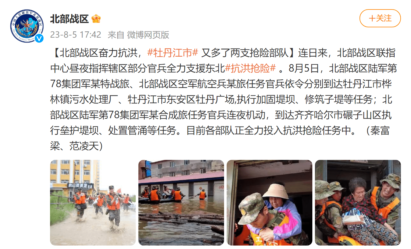 8月5日,北部战区陆军第78集团军某特战旅、北部战区空军航空兵某旅任务官兵依令分别到达牡丹江市桦林镇污水处理厂、牡丹江市东安区牡丹广场,执行加固堤坝、修筑子堤等任务;北部战区陆军第78集团军某合成旅任务官兵连夜机动,到达齐齐哈尔市碾子山区执行垒护堤坝、处置管涌等任务。目前各部队正全力投入抗洪抢险任务中。