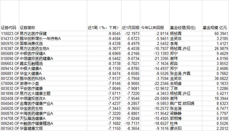 本周公募基金跌幅TOP20中,医疗保健为主题的基金比比皆是。