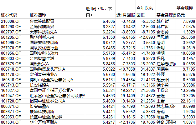 但如果剔除ETF,只看主动权益类基金的表现,你会发现,尽管还有几只证券主题的基金涨幅居前,但这份涨幅榜里出现最多的主题变成了“科技”,或者说AI。